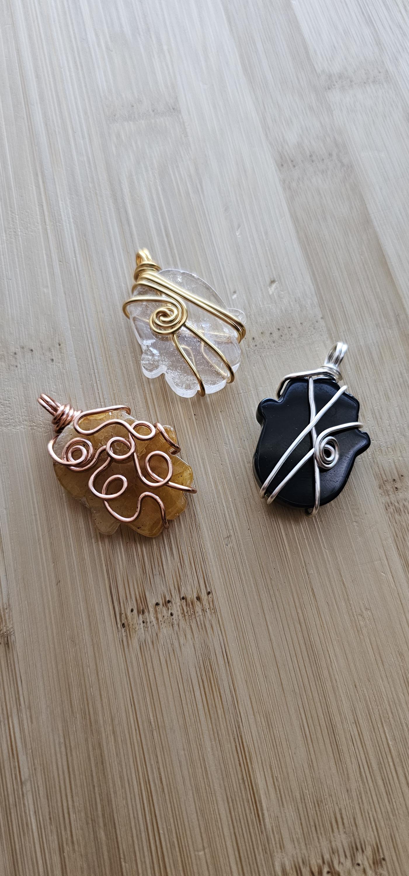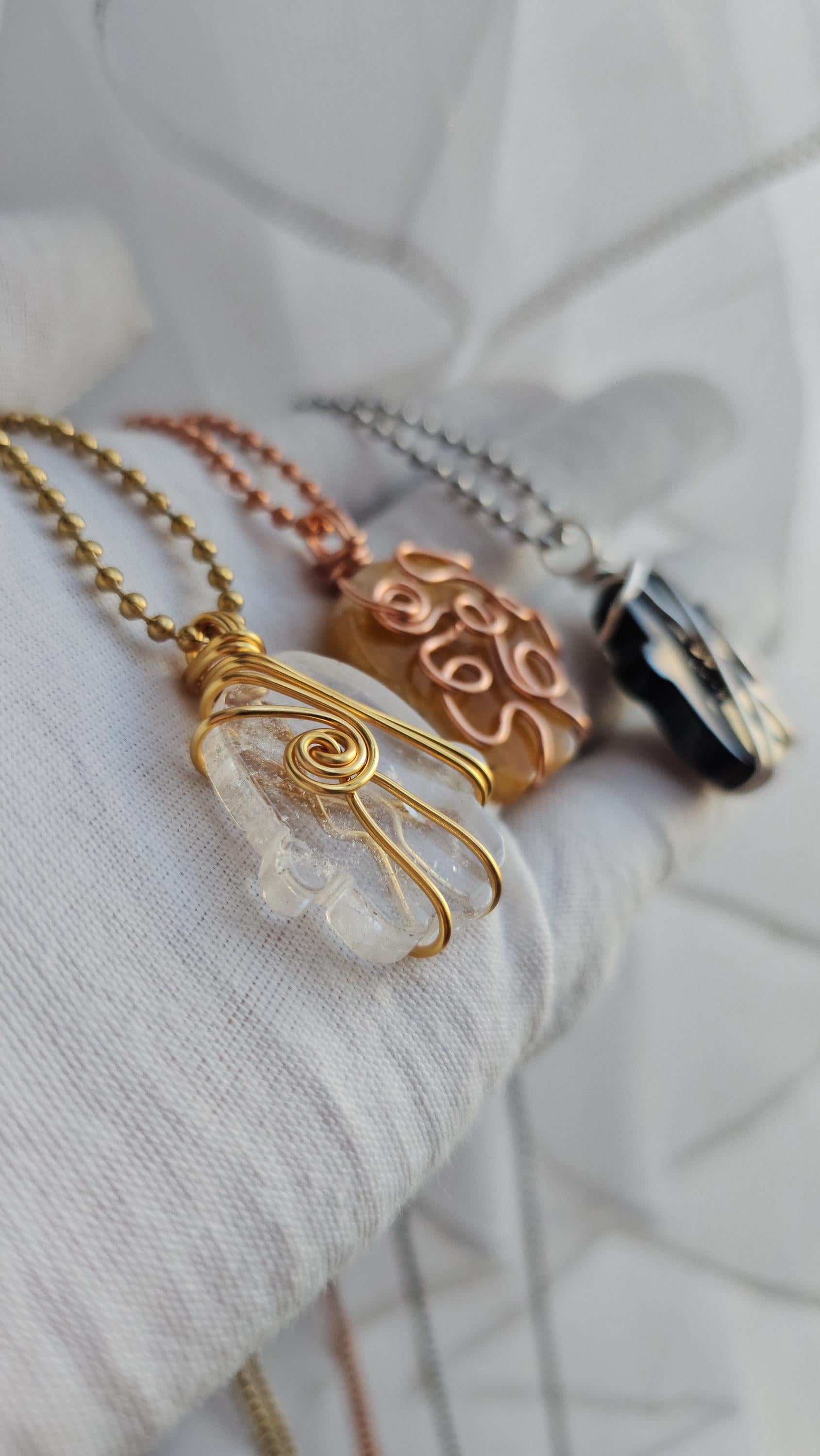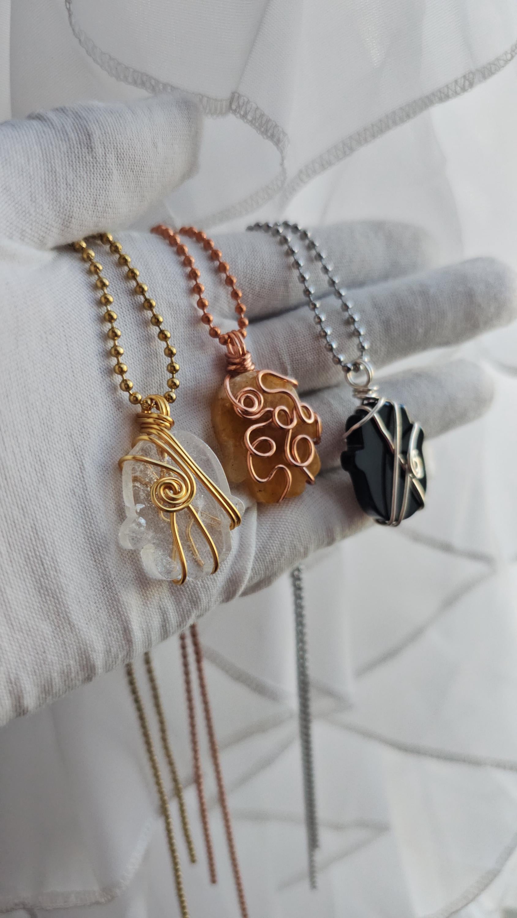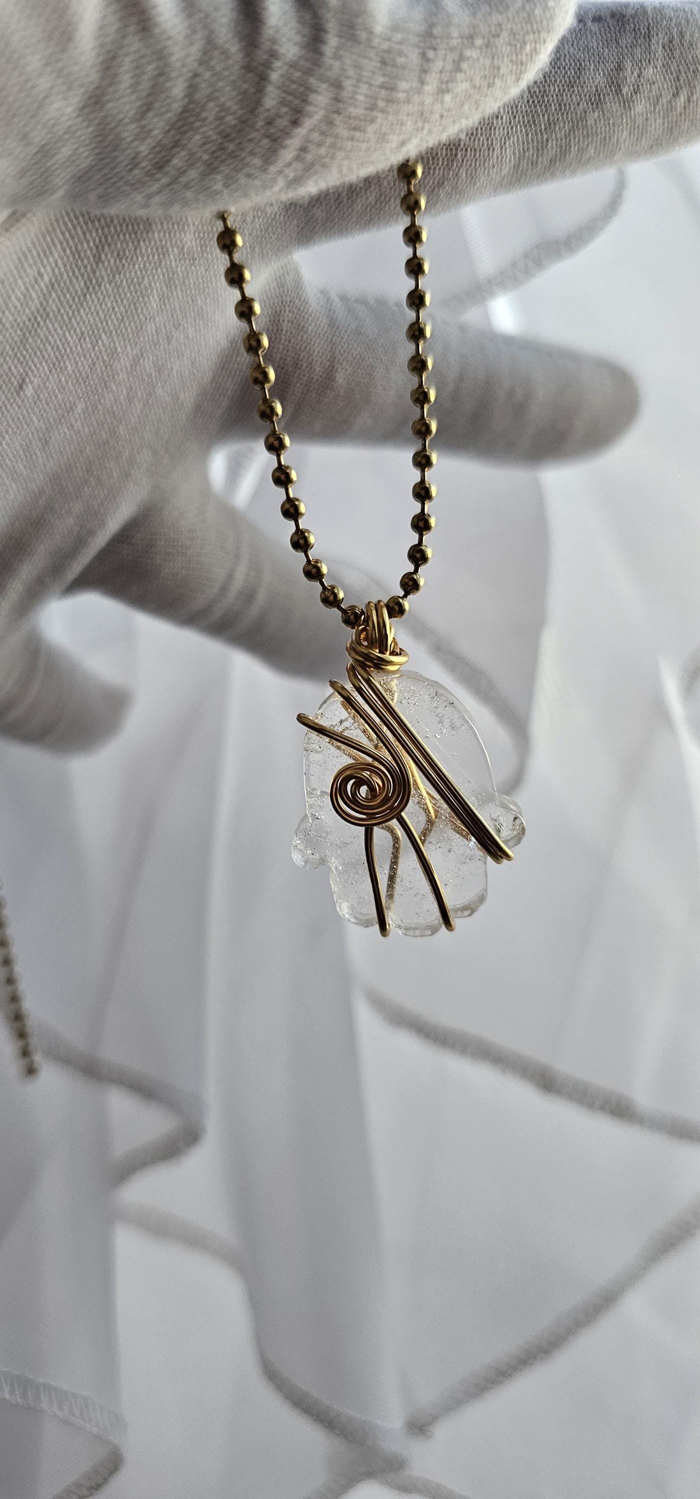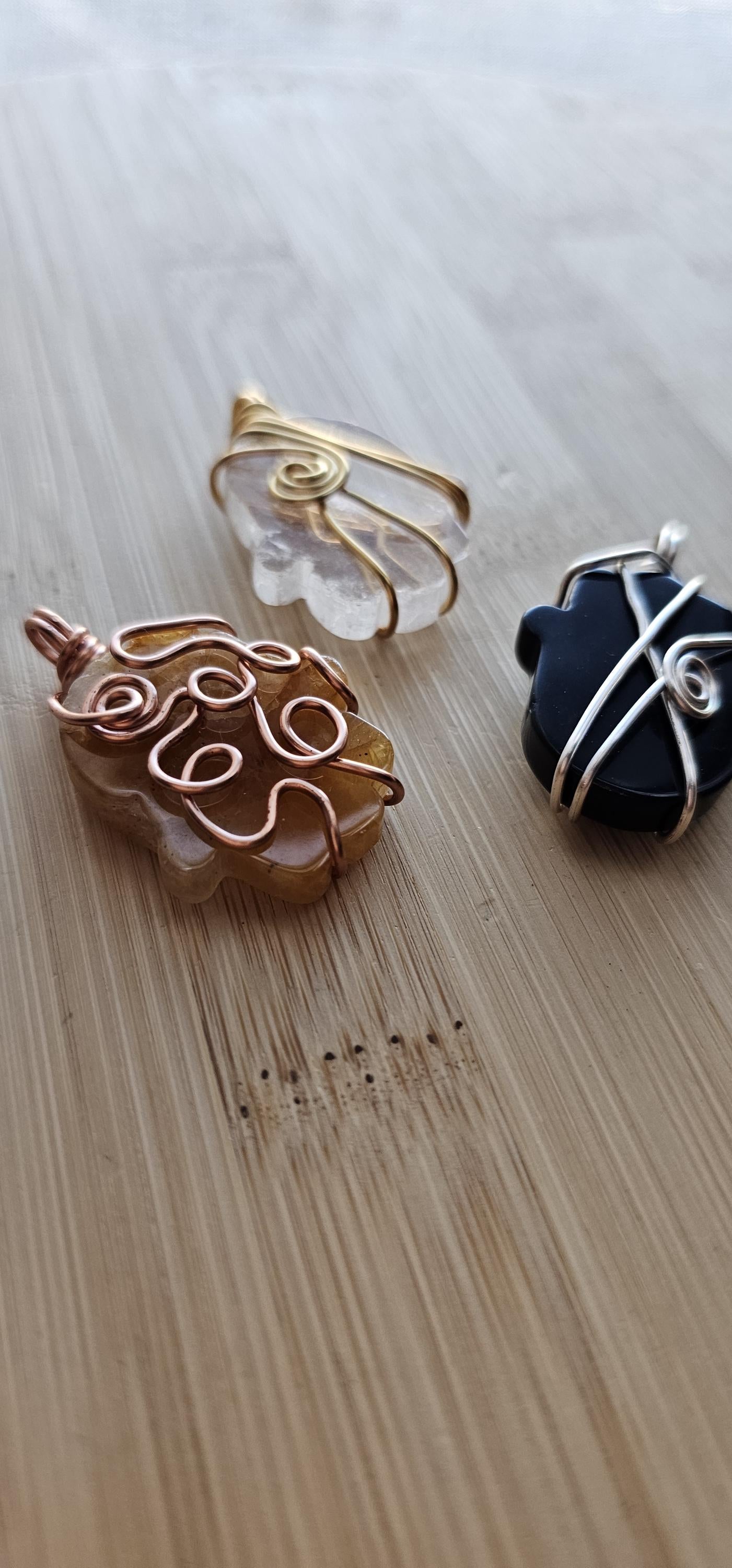 Each Hamsa hand crystal is uniquely wire wrapped by hand in one of three wrap styles — swirl, spiral, or wave — symbolizing flow and divine energy