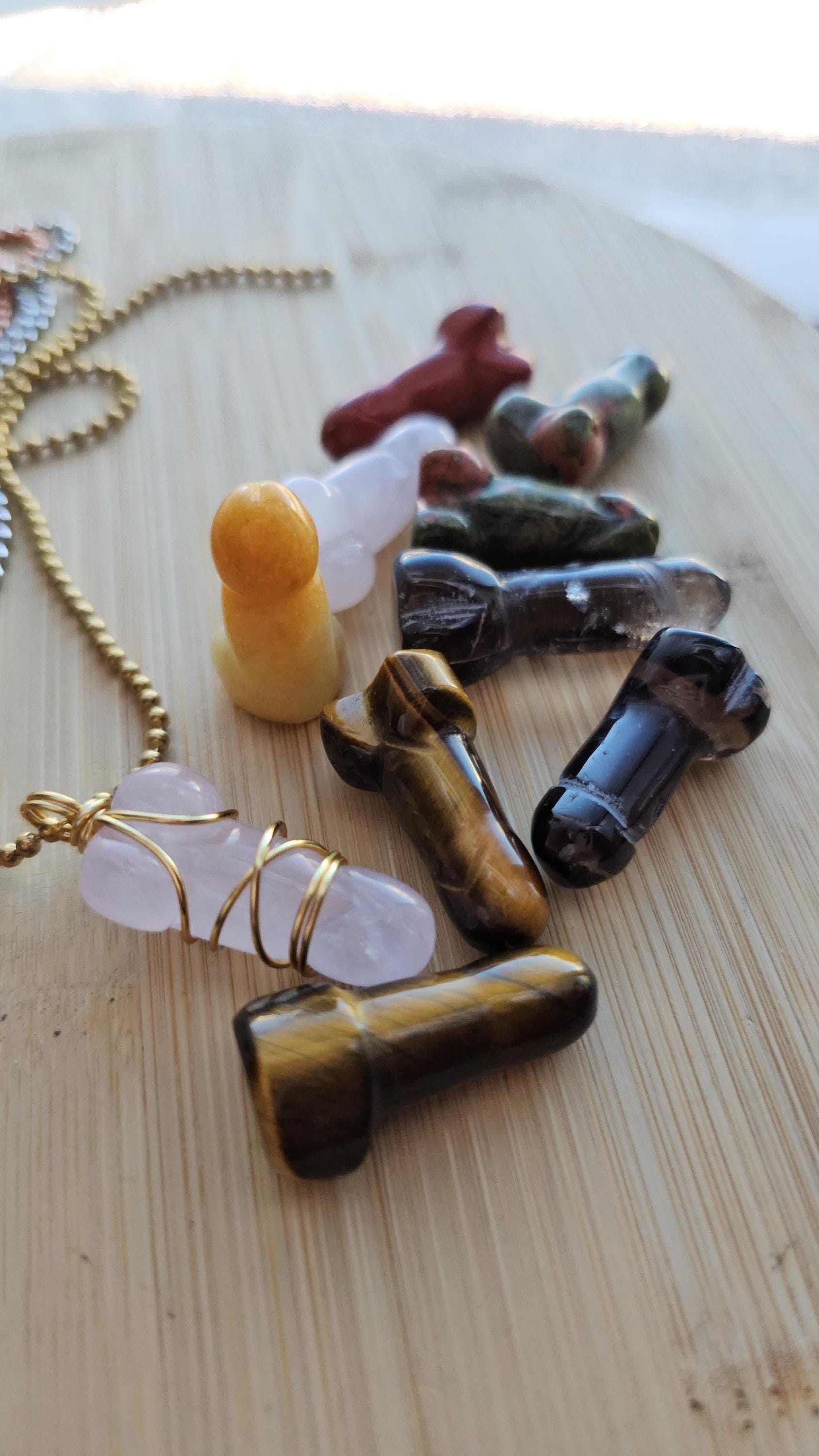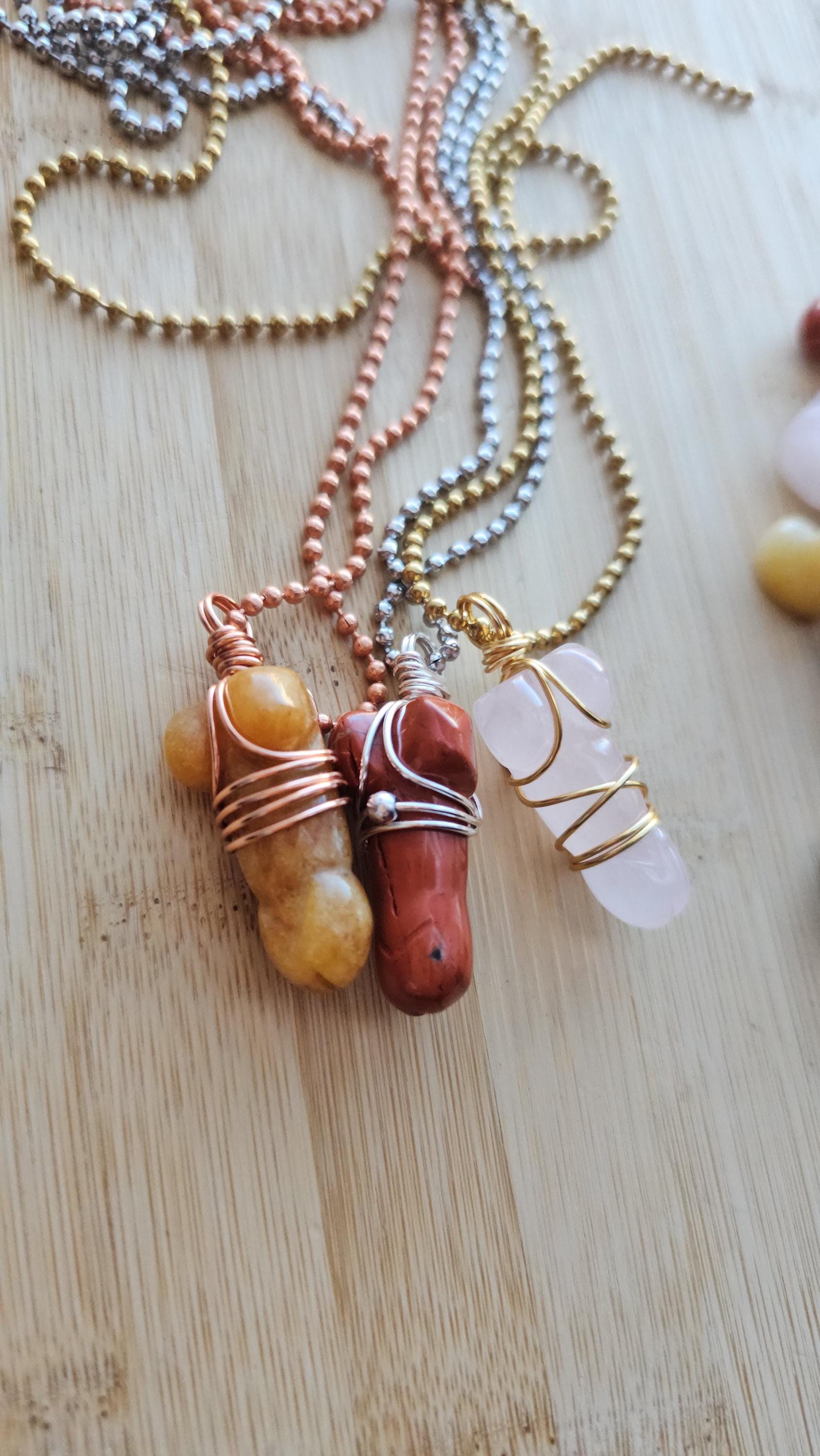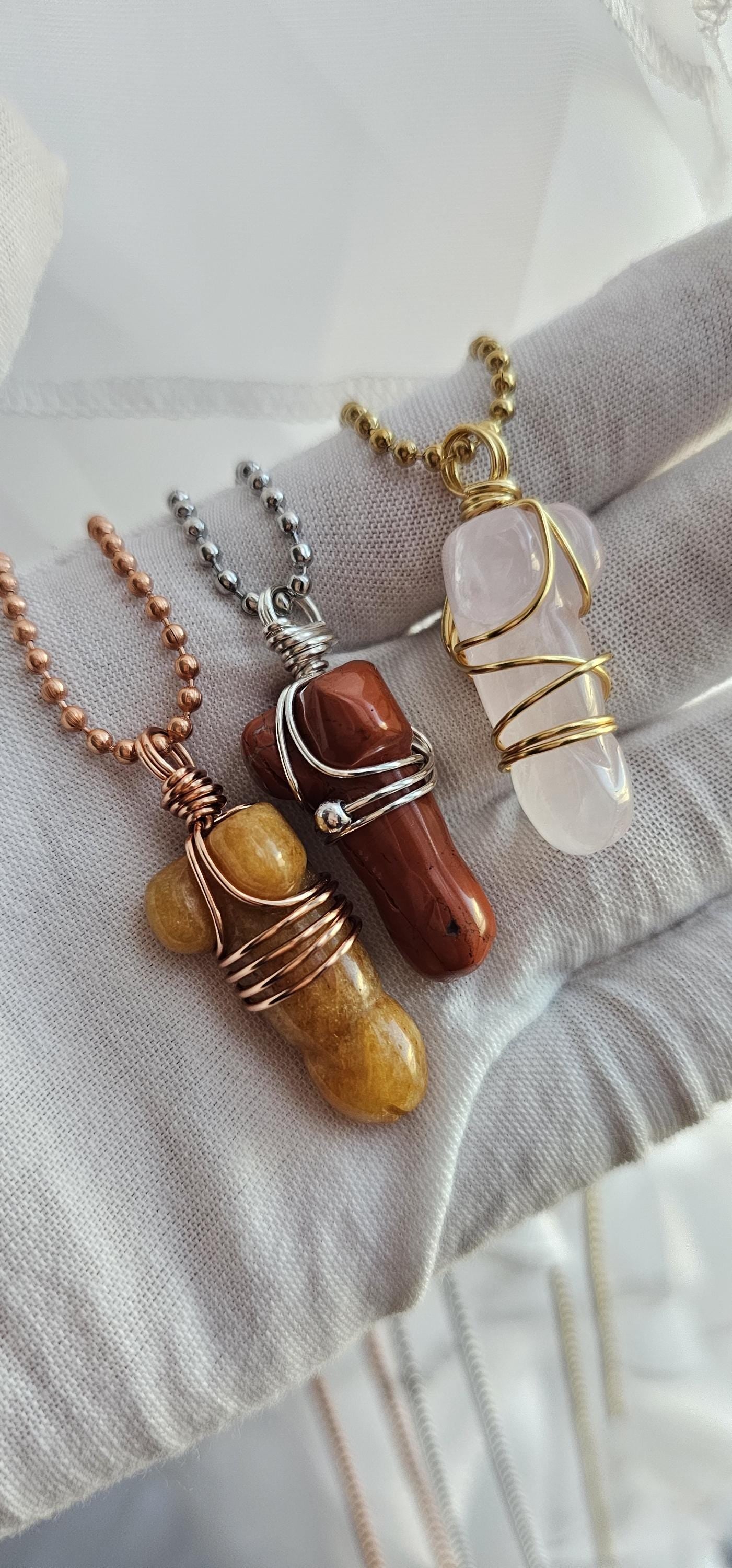 Embrace confidence, creativity, and balance with these handcrafted wire-wrapped crystal phallus necklaces. Each pendant is made from natural crystal and wrapped by hand in your choice of copper, gold, or silver wire, then paired with a matching stainless steel ball chain for a bold, modern finish.