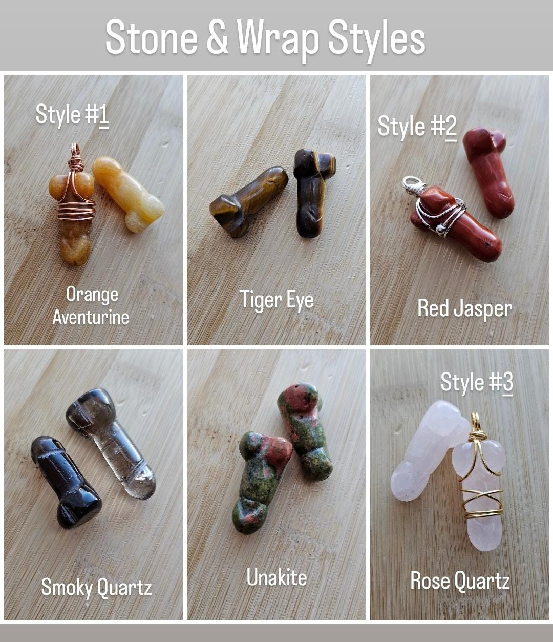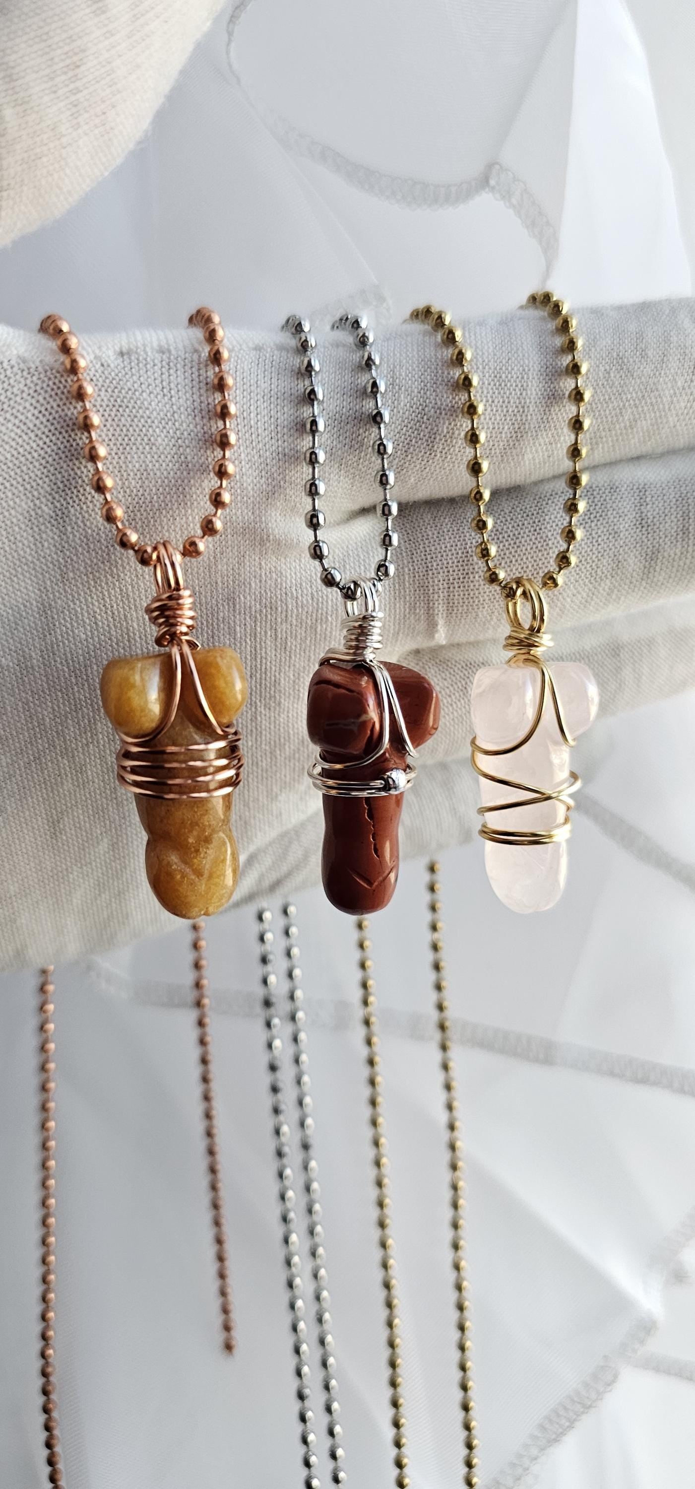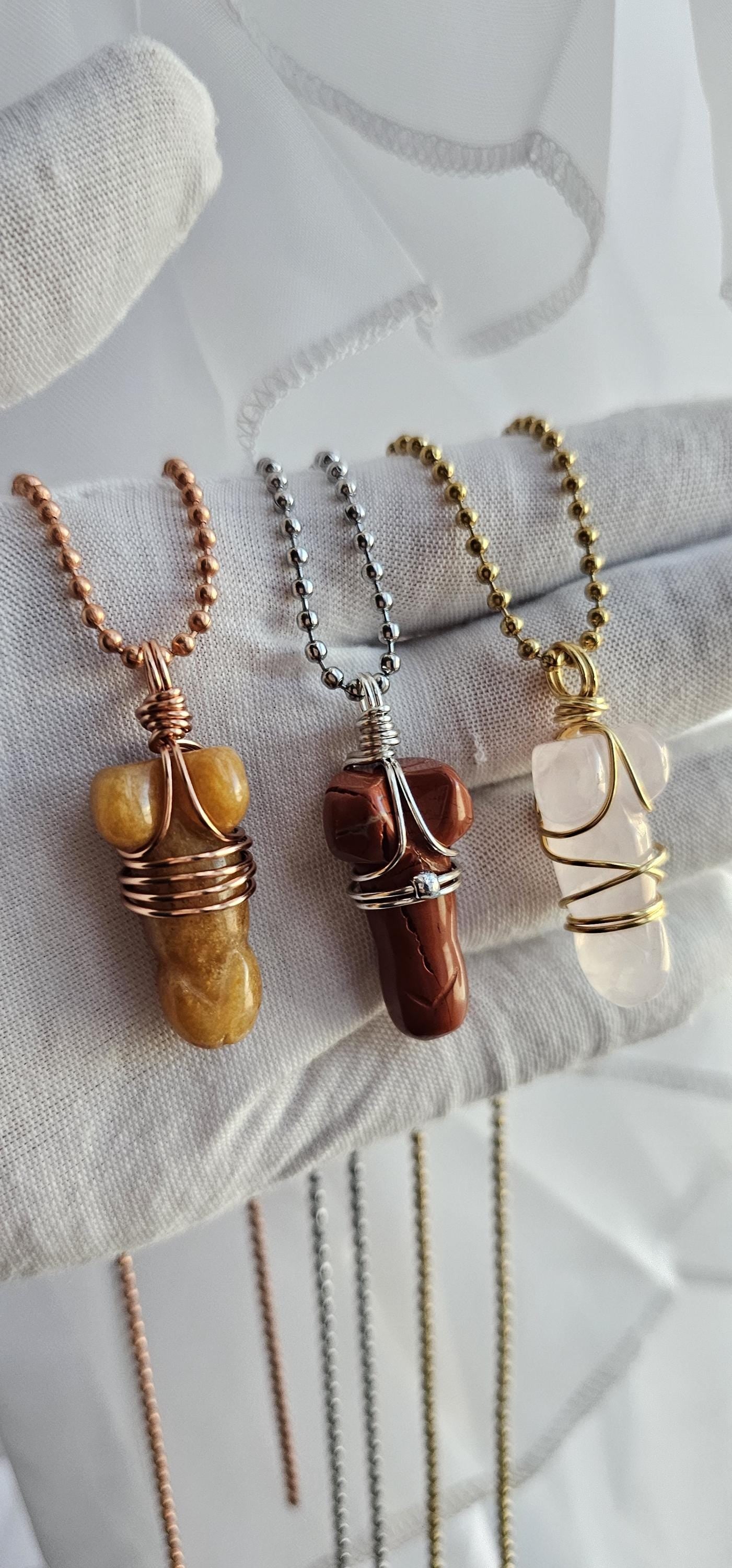 Embrace confidence, creativity, and balance with these handcrafted wire-wrapped crystal phallus necklaces. Each pendant is made from natural crystal and wrapped by hand in your choice of copper, gold, or silver wire, then paired with a matching stainless steel ball chain for a bold, modern finish.