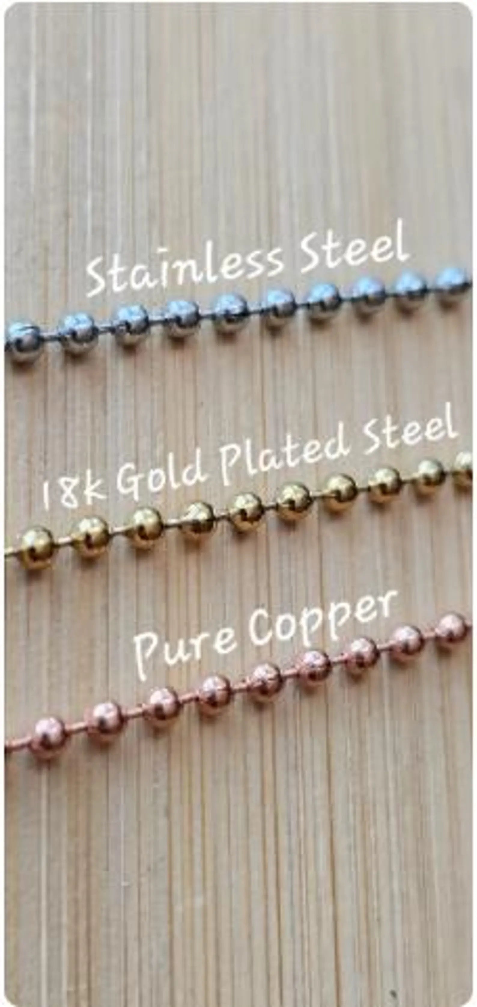 - Necklace materials: Copper ball chain is pure bare copper, all other colors are stainless steel